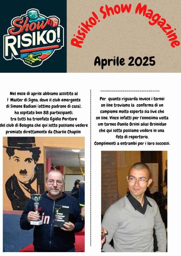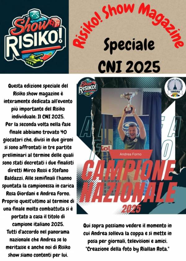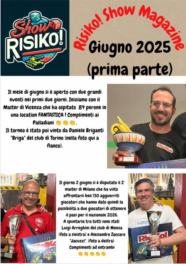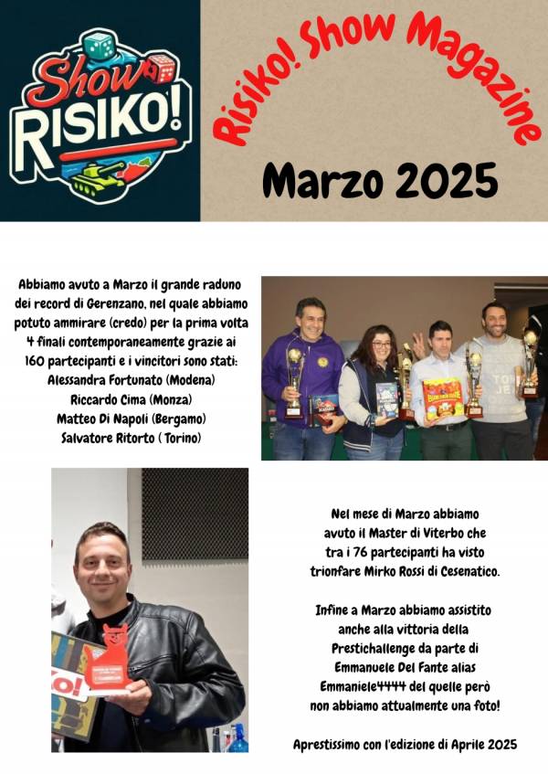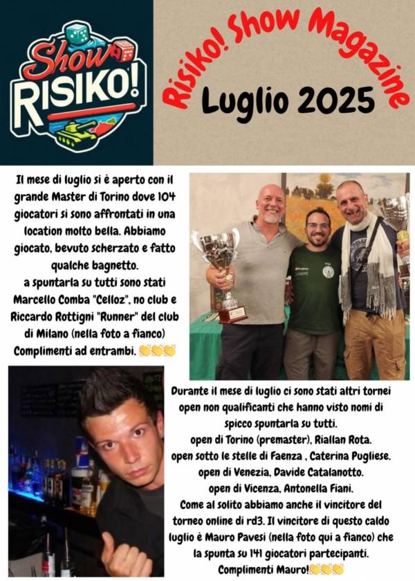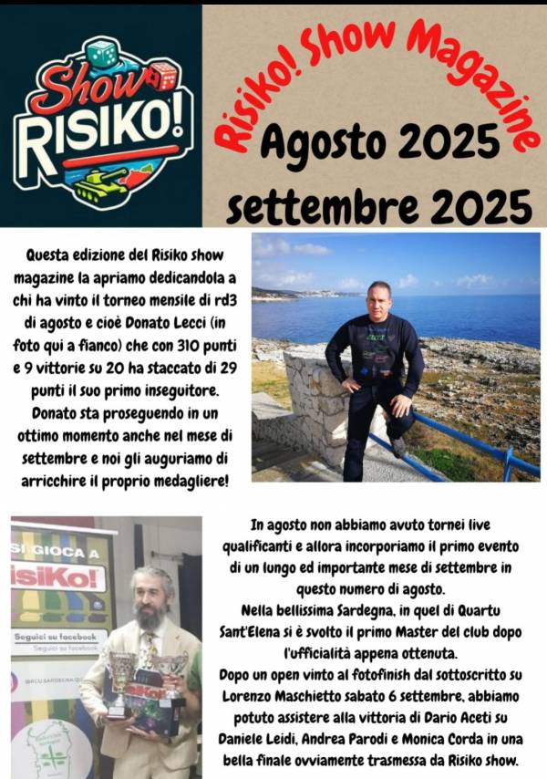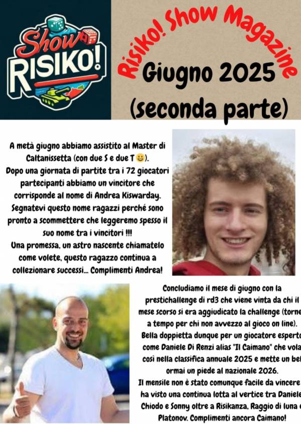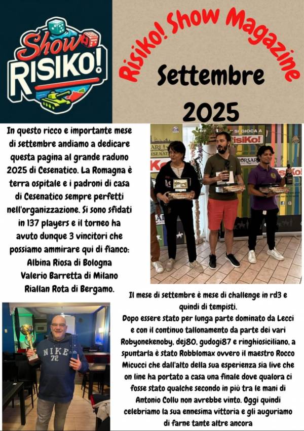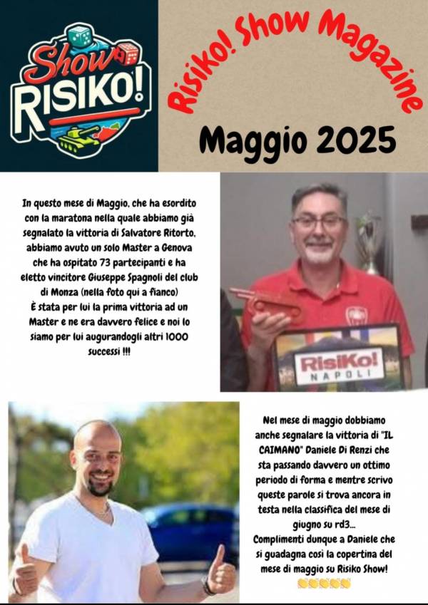 Nel gennaio 2025 nasce un nuovo progetto ideato dai membri dello staff RisiKo! Show. Questa volta si tratta di un vero e proprio editoriale a cadenza mensile, chiamato appunto RisiKo! Show Magazine, che ha tra gli obiettivi principali quello di divulgare, con maggiore consapevolezza, la cultura del gioco attraverso rubriche ed approfondimenti, che parlerà di tutti gli eventi accaduti nel RisiKo! agonistico, live ed online.